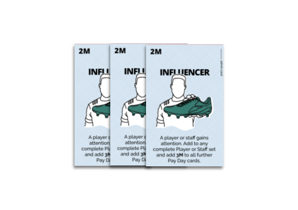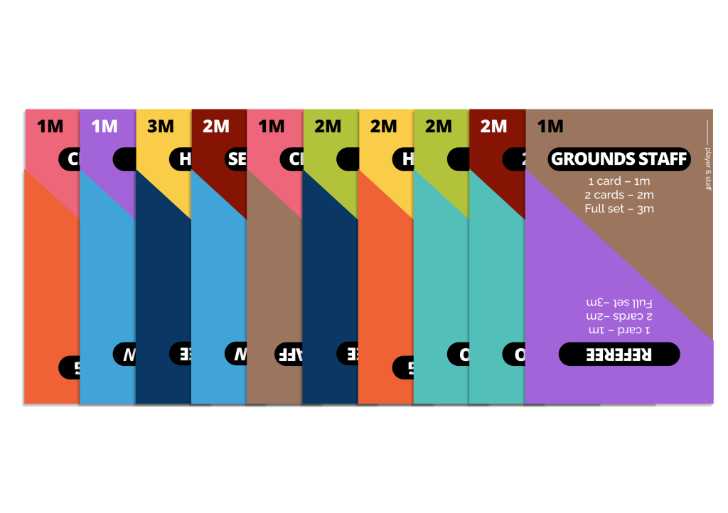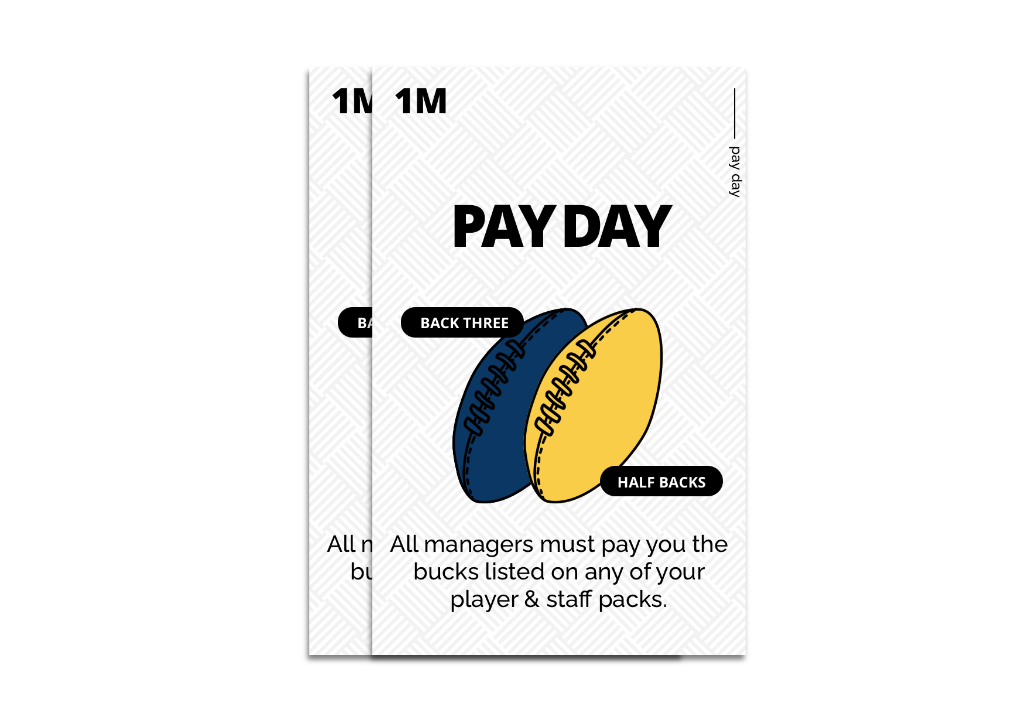 The game utilises 118 cards, divided into four key categories. 40 Player and Staff cards, 20 Rugby Bucks (the game’s currency), 42 Admin cards and 13 Pay Day cards (plus, we’ve included 3 kick off cards).